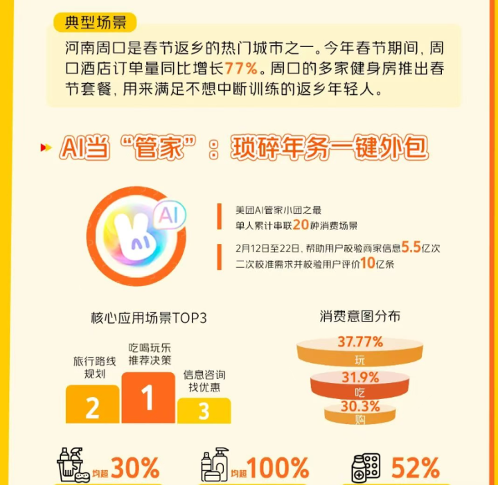 据了解,2月12日至22日,有过亿东说念主次通过好意思团AI管家“小团”打算土产货吃喝玩乐奢靡办法。“小团”基于用户发问,共校验了5.5亿次商家书息,二次校准需求并校验10亿用户评价,带动线下实体订单增长。同期,米兰体彩下载好意思团AI管家“小团”数据表示,2月12日至22日,好意思团AI管家“小团”已匡助用户校验5.5亿次商家书息,二次校准需求并校验10亿用户评价。用户向“小团”提倡了最多隐私20种土产货奢靡场景的复杂歪邪问题,跳跃30字的发问中,语音输入占比接近50%。