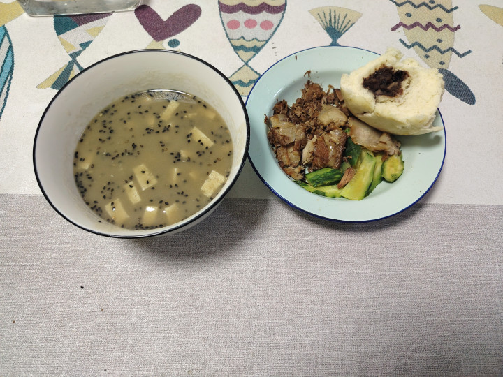 昨天的一日三餐,吃的碳水并未几,早上喝了茶面,吃了半个豆包,吃了点黄瓜和肉。