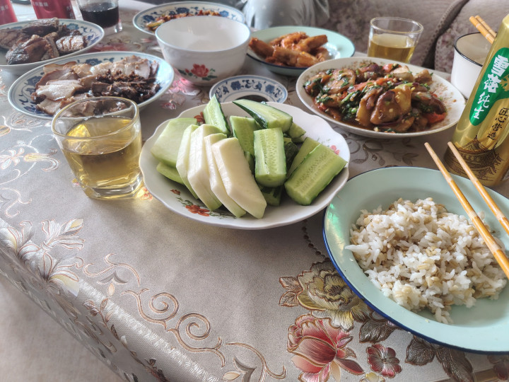 中午吃了一口杂粮饭,喝了两杯啤酒,配菜有烧茄子、油焖大虾、干炸带鱼、熟肉(猪肉和牛肉)、黄瓜和白萝卜。