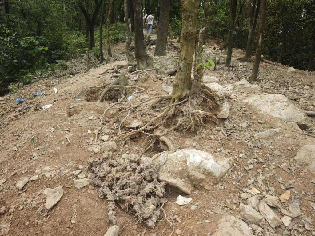 广州市黄埔区林业和园林局核查发现,暹岗大山、长平社区(石碑头山)北二环扩建规模步谈两侧,因采挖水晶致约8处点位稀薄林地被破裂,导致孔洞处林下植被遭破裂,个别树根露馅。现在事发点林木尚未出现枯死。