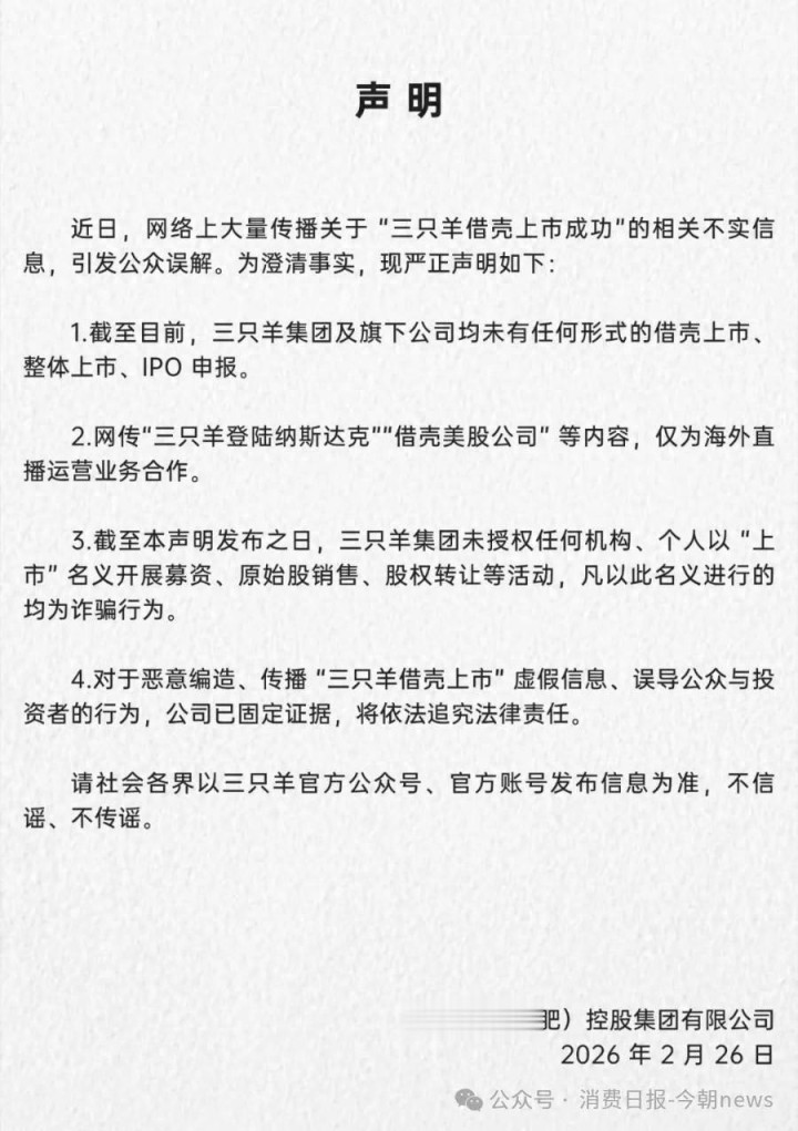 耗尽日报-今朝新闻讯,2026 年 2 月 26 日,三只羊(合肥)控股集团有限公司(以下简称 “三只羊集团”)发布官方声明,针对近期汇聚上庸俗传播的 “三只羊借壳上市顺利” 等演叨信息进行清醒,明确否定集团存在职何上市关系禀报行动,并对关系过错信息的传播及违章募资行作为出严正警示。